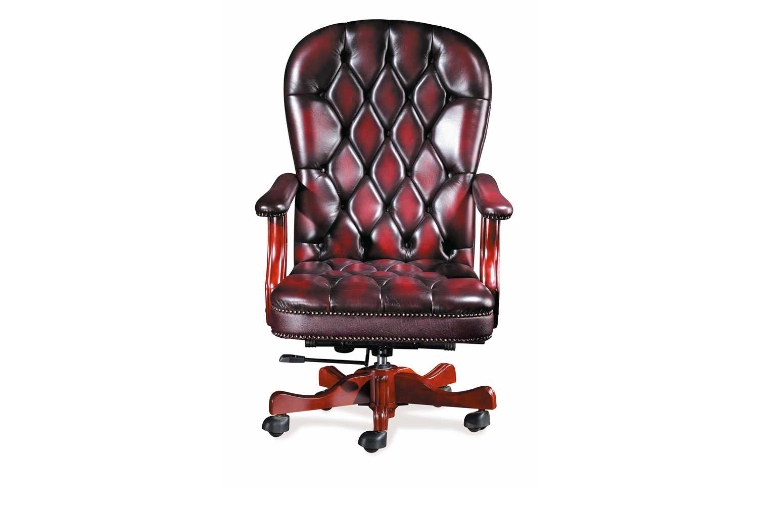 Description PU leather upper and scratch protected industrial leather for the back, one piece shell, mahogany wooden armrests, five star mahogany base. Also available in Medium Back #DB019A and Visitors Chair #DB019B.